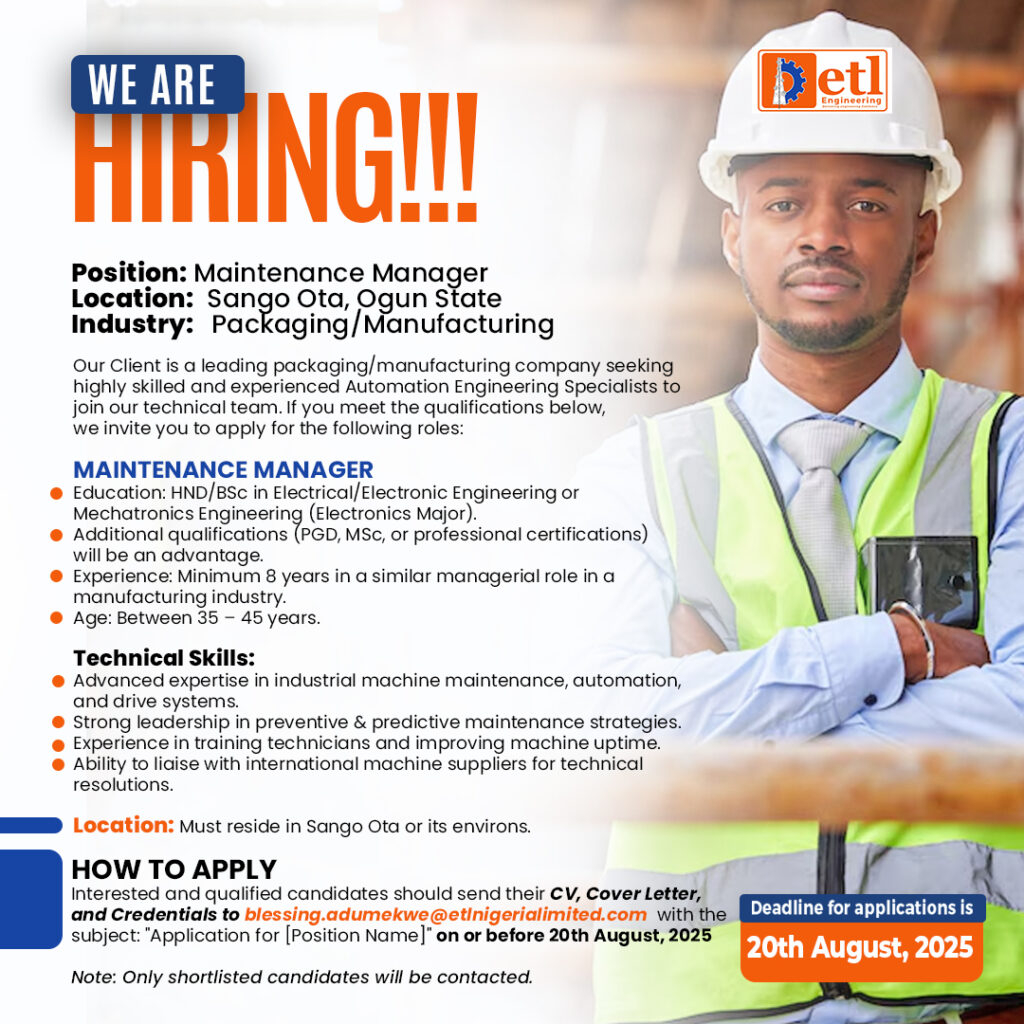 Interested and qualified candidates should send their CV, Cover Letter, and Credentials to blessing.adumekwe@etlnigerialimited.com with the subject: “Application for [Position Name]” on or before 20th August, 2025